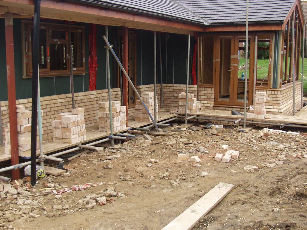 As the bricklaying progressed to the rear of the bungalow we realised that the line of the plinth was too high to fit under the garden-room window ledge. A quick decision was made to step the plinth down at this point. Most folk who look at the bungalow either don't notice, or if they do, think it is a deliberate design feature!