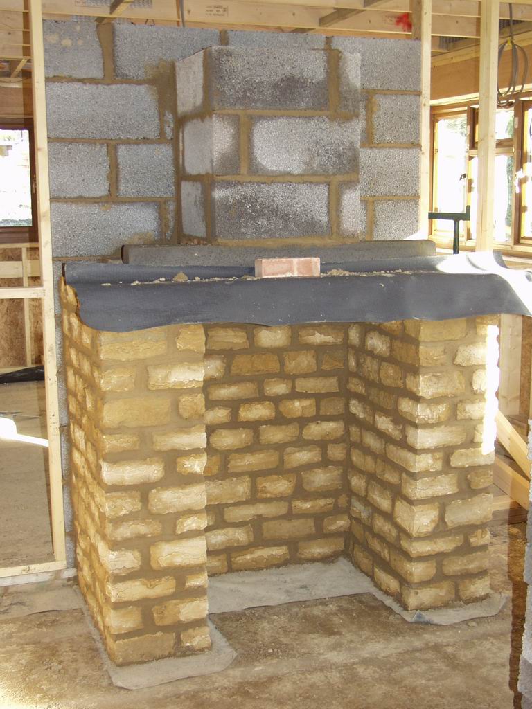 The same bricklaying team built the stone fireplace and then the chimney. We chose a local stone - "Pitsford cropped" - supplied by Bennies. Steve made a major contribution ...... fitting the cowl to the top of the chimney pot!