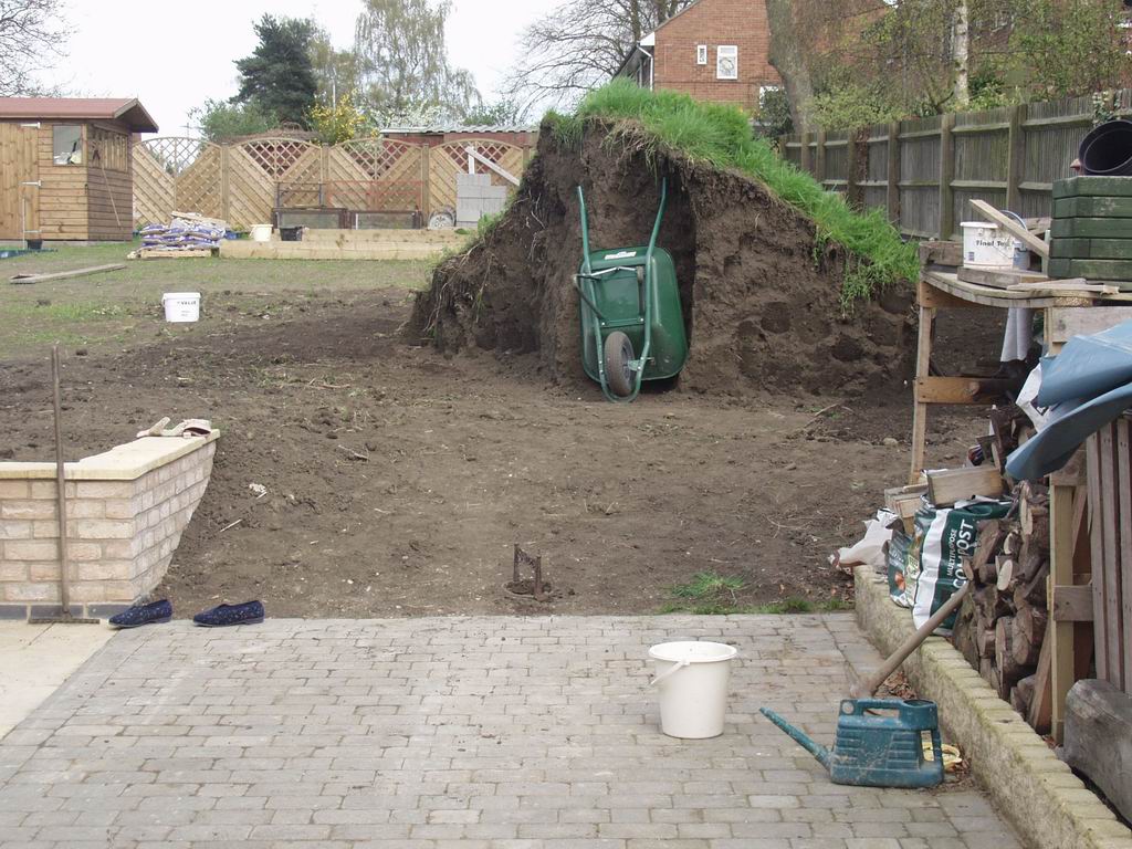 The heap of topsoil was gradually spread over the garden, levelling up to the top of the retaining wall. Steve did a bit each day, gradually nibbling away at the pile. Then one day when his back was turned it toppled over, denying him the pleasure of knocking the final column down himself!