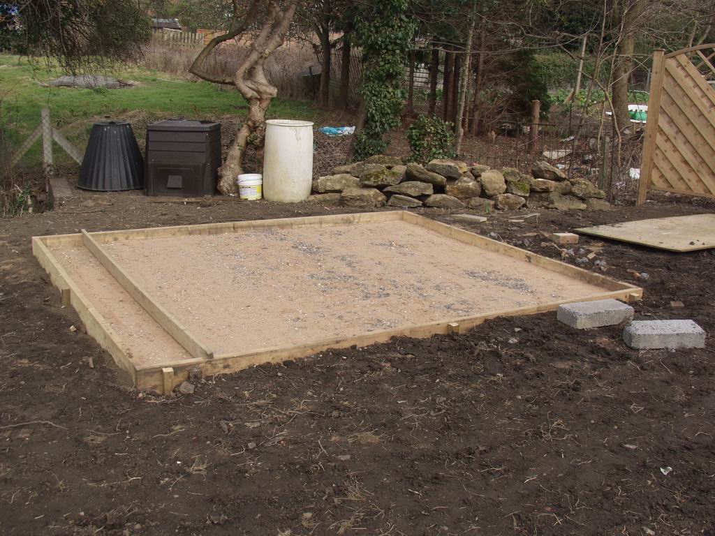 Betsy was keen to get the garden productive again as soon as possible, so a new potting shed was high on the list of priorities. Because of the tricky site access we bought a mixer and mixed up concrete for the base ourselves.
