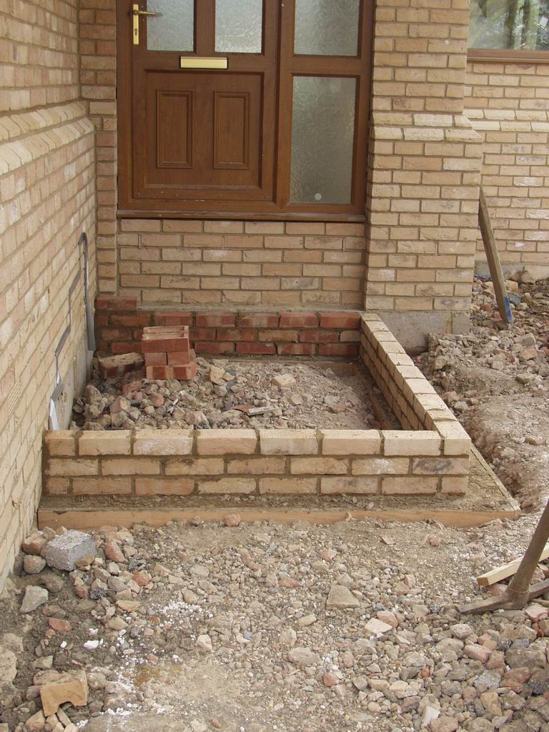 Steve tried his hand at some brickwork to form the steps up to the front door of the bungalow. The sloping site meant that there was quite some height to be made up. The Building Inspector gave us advice on the appropriate width, height and depth of each tread to comply with "disabled access" requirements.