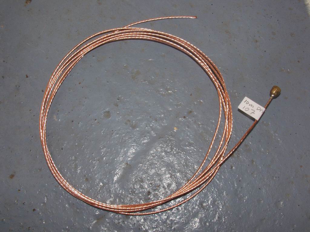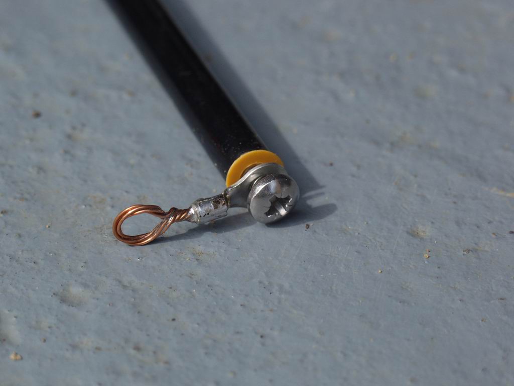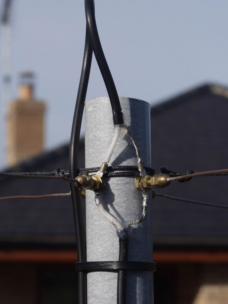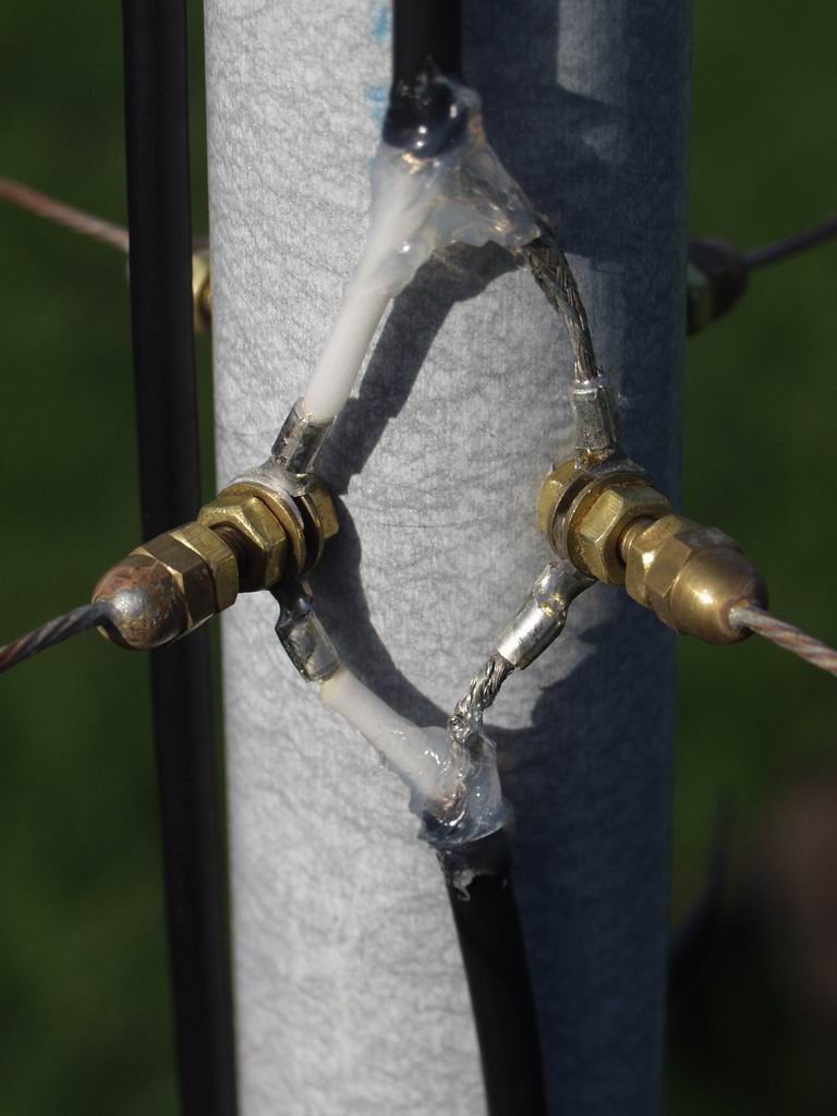 I used 16 gauge 7-strand copper wire - its tough enough to withstand the tension of the spreaders, but not so heavy that the wires sag. To provide a fixing at the centre post I drilled a hole in a 1/6" brass "dome nut" and soldered it onto the wire. At the outer end I fixed the wire to the insulating cords using brass terminal blocks and brass screws; I used 2 screws in the terminal blocks for the top wires because they need to withstand the tension of the spreaders. The right hand picture shows one of the wires cut to length and ready for loading on the support structure; you'll need 4 of these for each band. Be sure to label them with the band, and whether they are Driver or Reflector - it's very easy to get them muddled up!