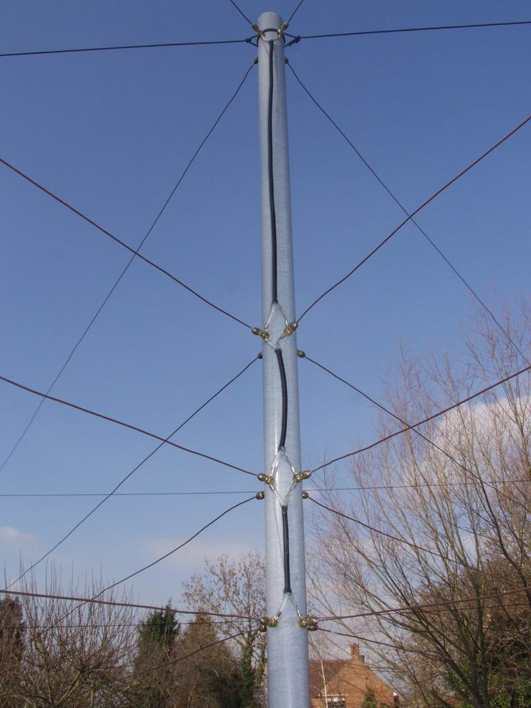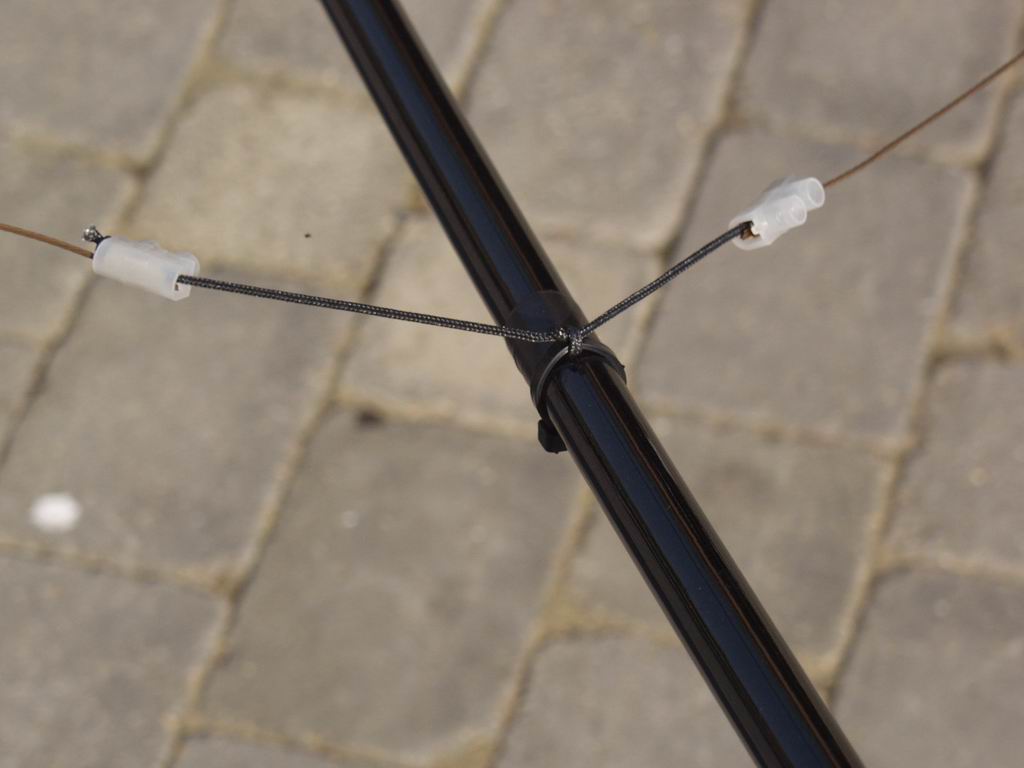The spreaders are low-cost, 15ft fibreglass fishing poles with the final section unused - it's too "whippy". I fix the poles to the aluminium angle with 4 tie-wraps. Amazingly the poles and their fixings survived when the Mk1 fell to ground from a height of 20ft!