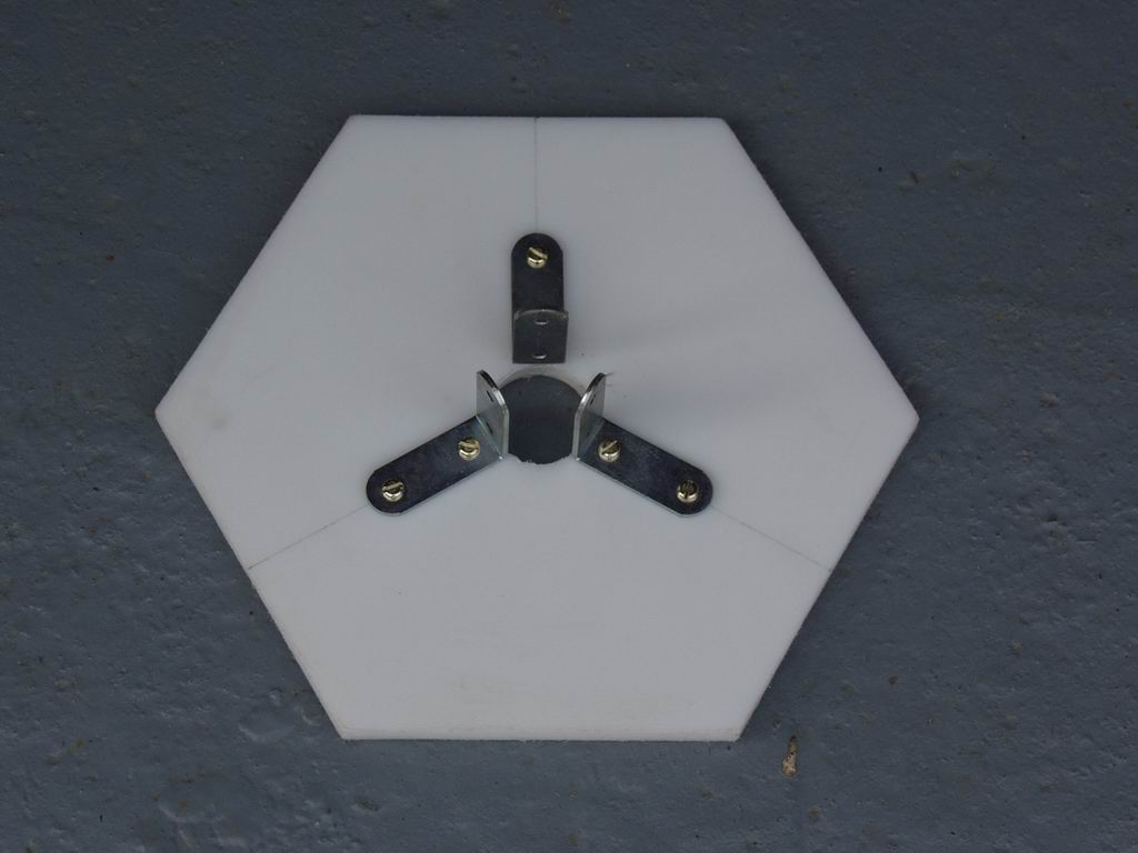 These two photographs show the original baseplate and centre post arrangement. The baseplate was made from a plastic kitchen chopping board and the centre post was cut from a length of PVC pipe. They were fixed together with 3 angle brackets; it was this mounting arrangement which failed in the strong winds. I've no doubt that the choice of materials would have been fine if had I joined them more securely.