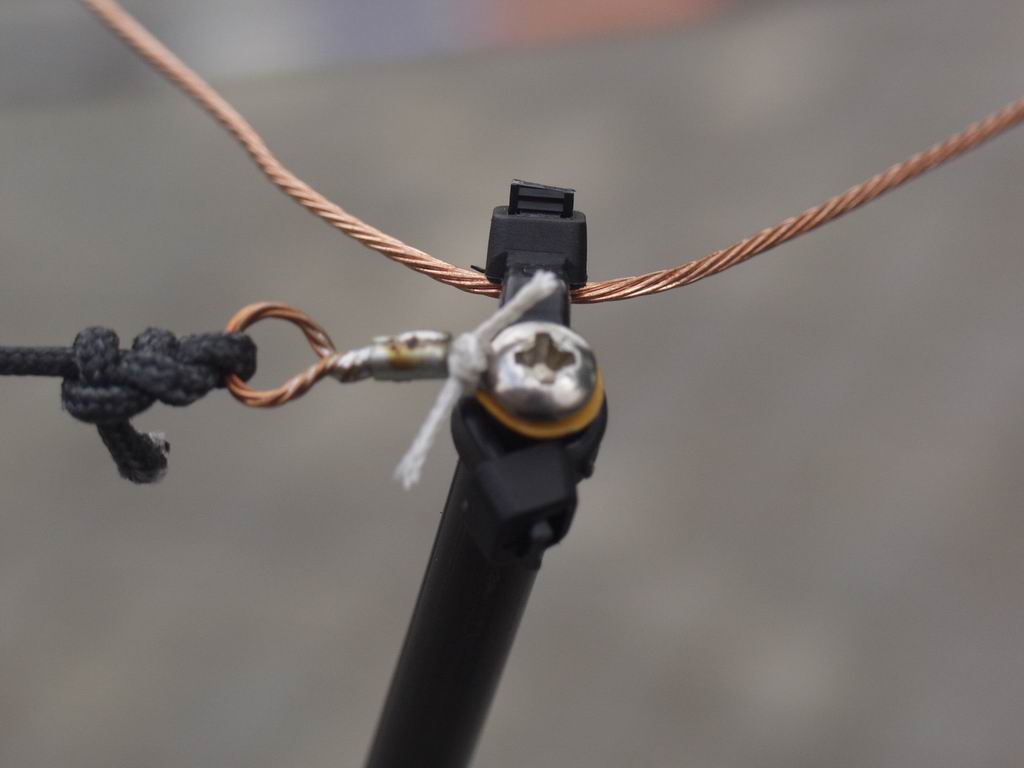 These photos show how the wires are held onto the support structure; I typically use 2 tie wraps - one to form a loop, and the other to tie the loop onto the spreader. I put a couple of turns of insulating tape around the spreader to prevent the loop slipping inwards. The end insulating cord is held by passing a tie wrap through a centre knot. The wires terminate at the centre post on a 1/6" brass screw which has 2 extra nuts on it - one is a locknut for the dome nut and the other holds the spade terminals in place. The right hand photo shows a link joining two halves of a Reflector.